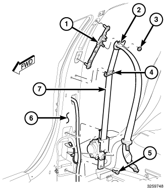 1. Position the front seat belt (7) and retractor into the vehicle as a unit.