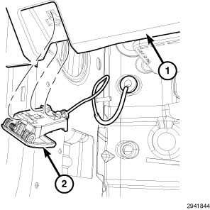 9. Install the hood release handle (2) to the knee blocker trim by aligning and pushing up.