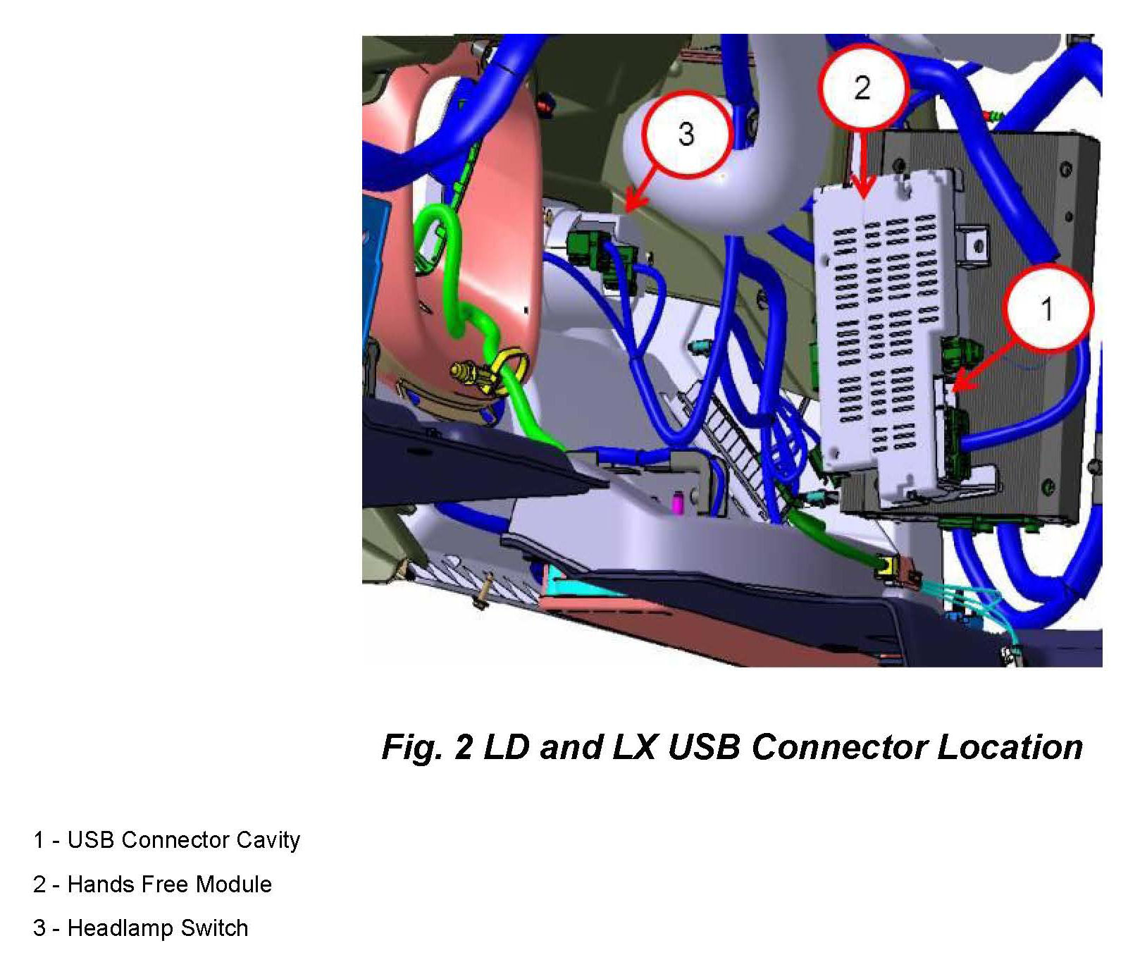 For JC vehicles, the wiTECH cable is plugged into the Delphi 4-Way USB connector which is located next to diagnostic connector on the driver side (Fig. 1). For the LD or LX vehicles the wiTECH USB Cable is plugged directly into the HFM Module which is located above the driver's side kick panel (Fig. 2).