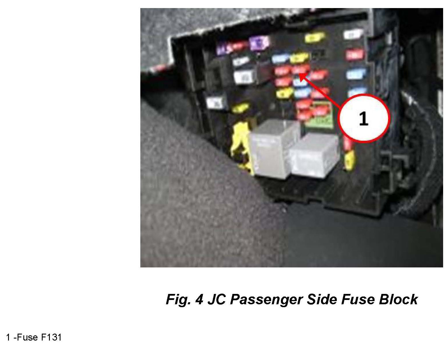 A module reset may be required in the event that an abort recovery is necessary. Procedures vary slightly between LD/LX and JC. LD/LX module power will be reset by removing the C1 connector from the HFM (Fig. 3). On JC vehicles, the module power will be reset by removing fuse F131 from the passenger side fuse block (Fig. 4).