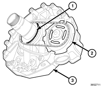 The transmission oil pump (2) is driven by a chain and sprocket (1). The oil pump is located just behind the torque converter, inside of the pump housing (3). The pump is a double-stroke vane pump. The pump has dual chambers, two inlet and two outlet ports. The pump provides necessary lubrication and cooling throughout all phases of transmission operation.
