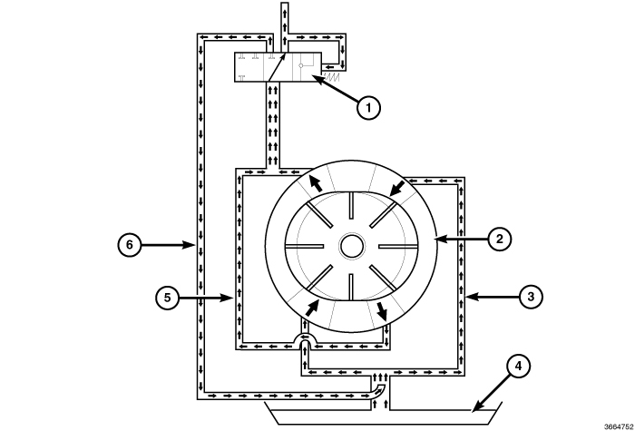 The transmission oil pump is driven by a chain and sprocket. The oil pump has two intake ports and two exhaust ports. The pump draws fluid through a filter and pressurizes the fluid as the pump rotates. After the fluid is pressurized, it exits the pump through two exhaust ports that feed the system pressure valve. The system pressure valve maintains fluid pressure and allows excess pressure to return to the pump. This reduces cavitation and noise.