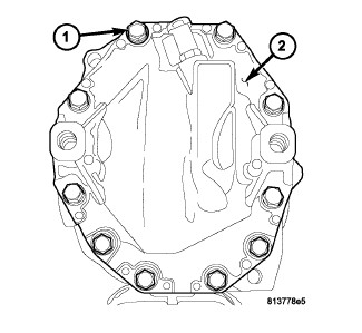 1. After thoroughly cleaning axle housing cover (1), apply a 4 mm (0.157 in.) bead (2) of Mopar(R) Axle RTV as shown.