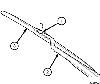 2. Position the wiper blade and element unit (3) near the hook formation on the tip of the arm with the notched end of the wiper element flexor oriented towards the end of the wiper arm that is nearest to the wiper pivot.
