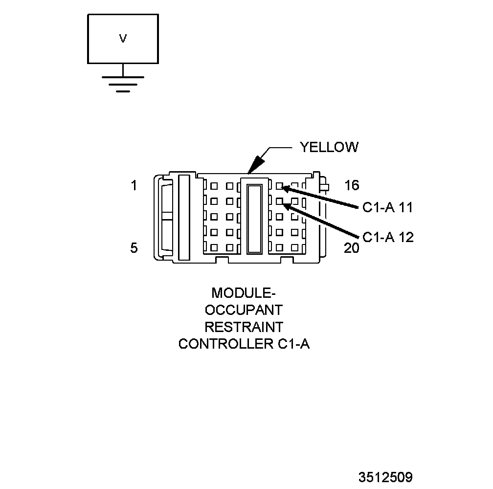 4. Measure the resistance between the (R63) Driver Squib 2 Line 1 circuit terminal C1A - 12 and the (R61) Driver Squib 2 Line 2 circuit terminal C1A - 11 at the ORC module body harness connector.