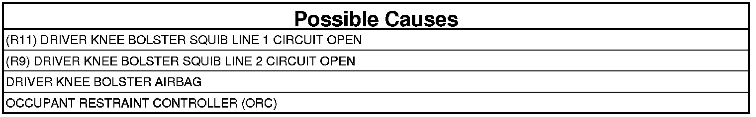 - Repair the (R11) Driver Knee Blocker Squib Line 1 circuit for an open.