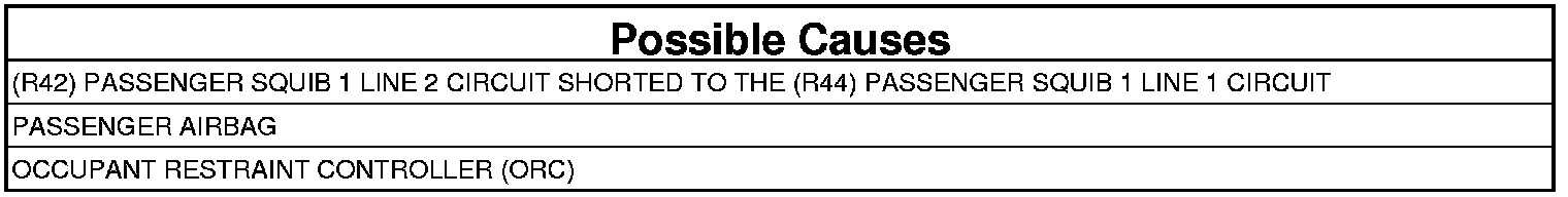 - Repair the (R42) Passenger Squib 1 Line 2 circuit for a short to the (R44) Passenger Squib 1 Line 1 circuit.