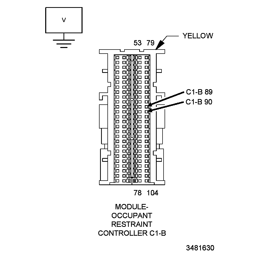 4. Measure the voltage of the (R6) Right Seat Squib 1 Line 2 circuit between the ORC Module body harness connector terminal C1-B 90 and ground.