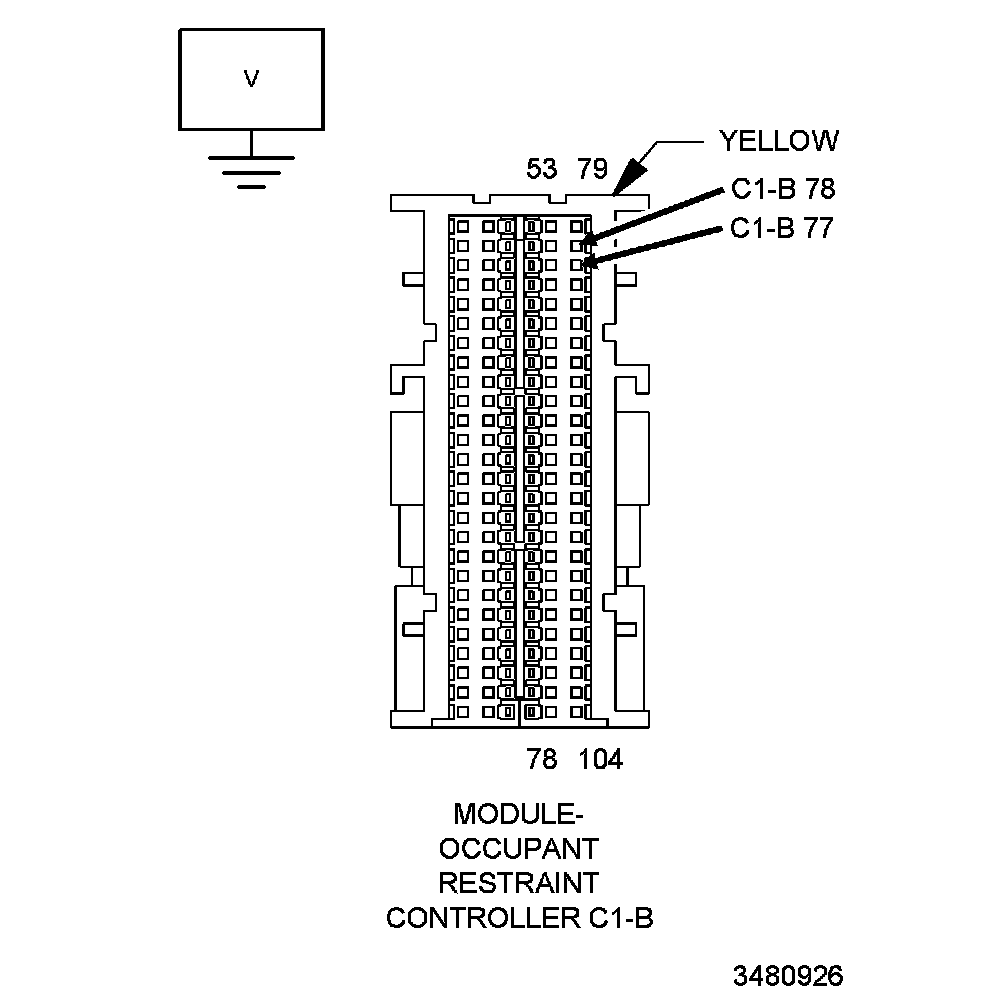 4. Measure the voltage of the (R4) Right Curtain Squib 1 Line 1 circuit between the ORC Module body harness connector terminal C1-B 77 and ground.