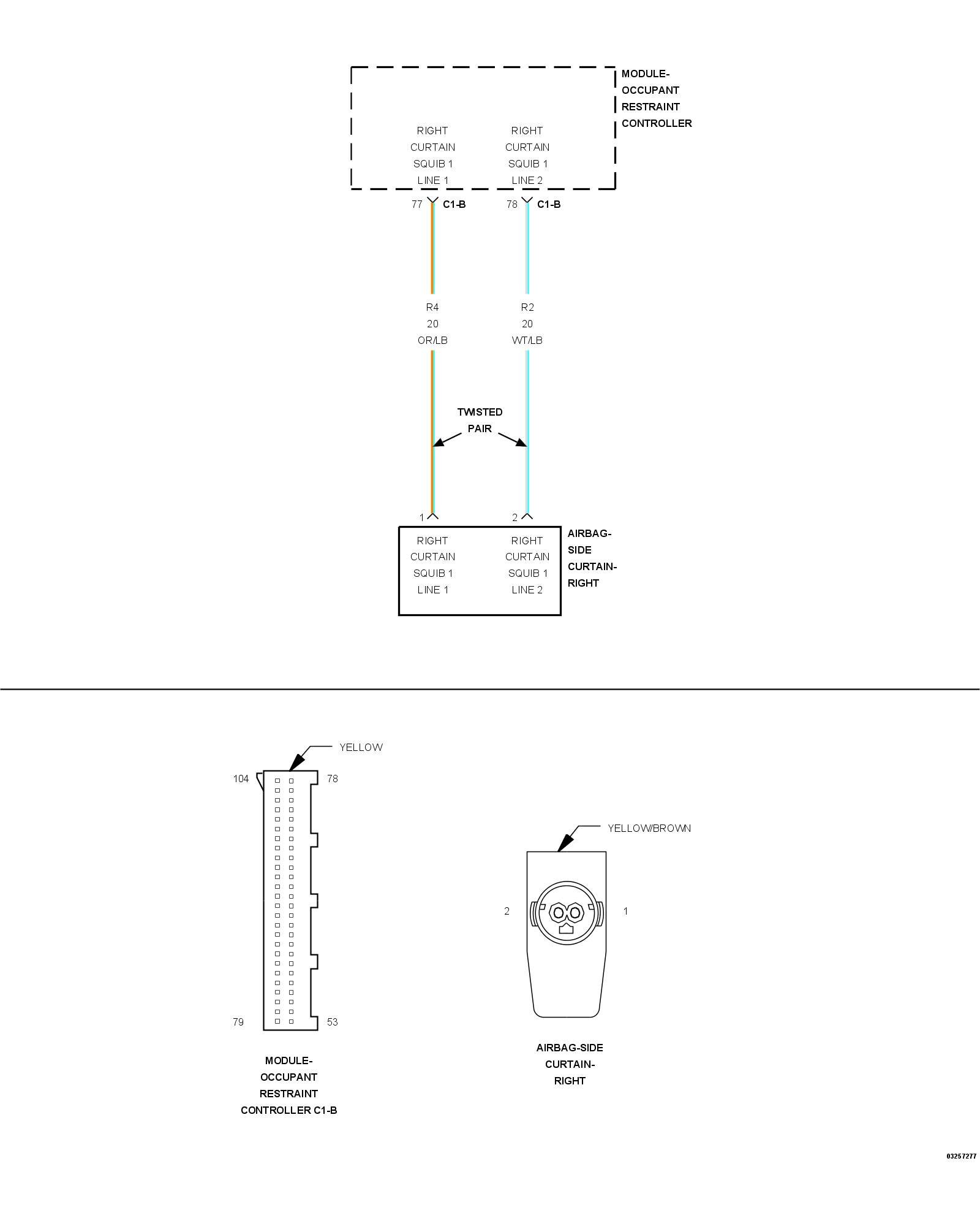- Repair the (R4) Right Curtain Squib 1 Line 1 circuit for a short to the (R2) Right Curtain Squib 1 Line 2 circuit.
