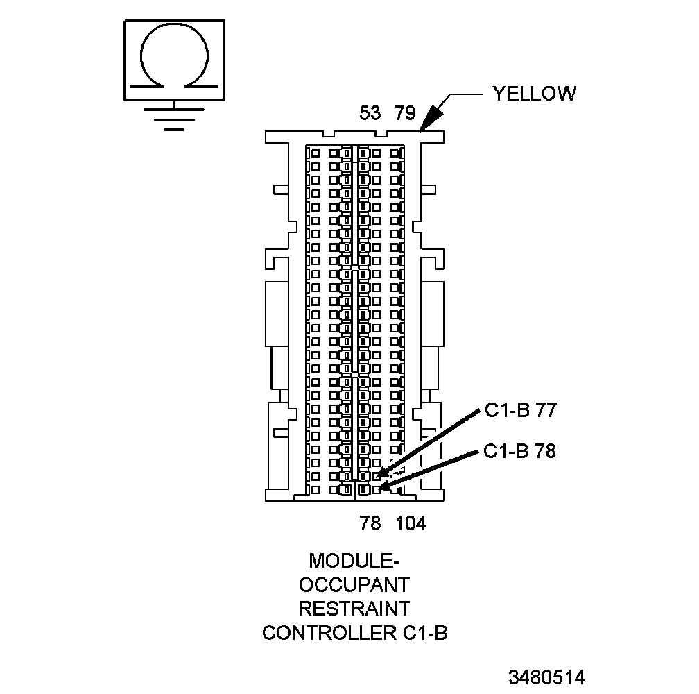 4. Measure the resistance between the (R4) Right Curtain Squib 1 Line 1 circuit and the (R2) Right Curtain Squib 1 Line 2 circuit at the Right Side Curtain Airbag connector at the ORC Module body harness connector terminals C1-B 77 and C1-B 78.