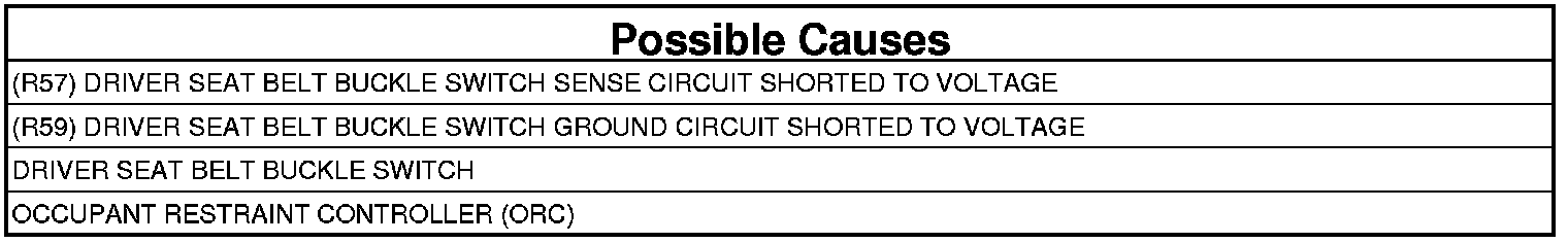 - Repair the (R57, R59) Driver Seat Belt Buckle Switch circuit for a short to voltage.