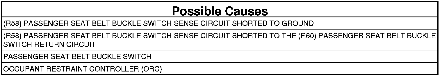 - Repair or replace the (R58) Passenger Seat Belt Switch Sense circuit for a short to the (R60) Passenger Seat Belt Switch Return circuit.