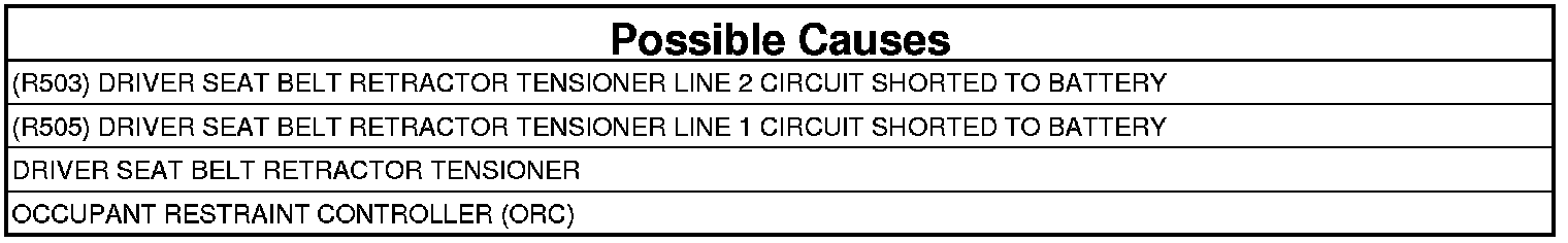 3. CHECK (R505) DRIVER SEAT BELT RETRACTOR TENSIONER LINE 1 CIRCUIT AND (R503) DRIVER SEAT BELT RETRACTOR TENSIONER LINE 2 CIRCUIT FOR A SHORT TO BATTERY