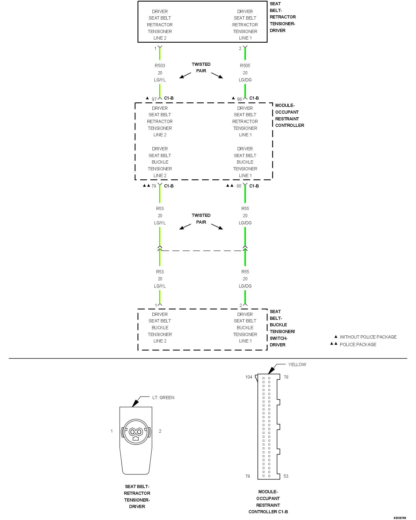 3. CHECK (R505) DRIVER SEAT BELT RETRACTOR PRETENSIONER FOR A SHORT TO (R503) DRIVER SEAT BELT RETRACTOR PRETENSIONER