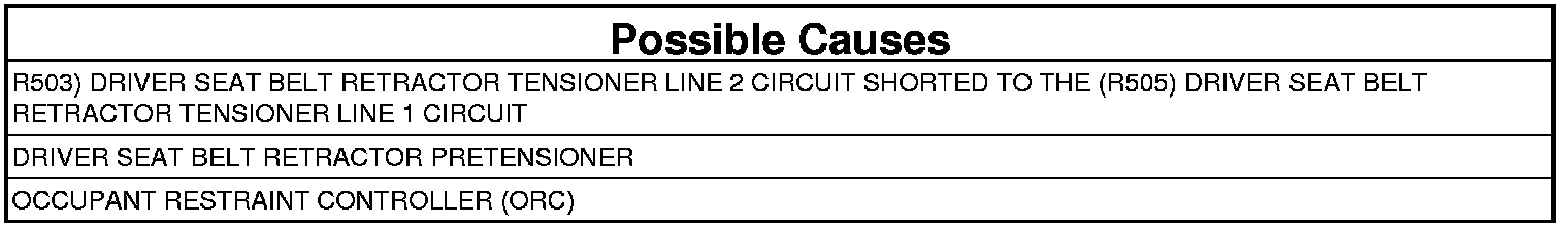 - Repair or replace the (R505) Driver Seat Belt Retractor Tensioner Line 1 circuit for a short to the (R503) Driver Seat Belt Retractor Tensioner Line 2 circuit.