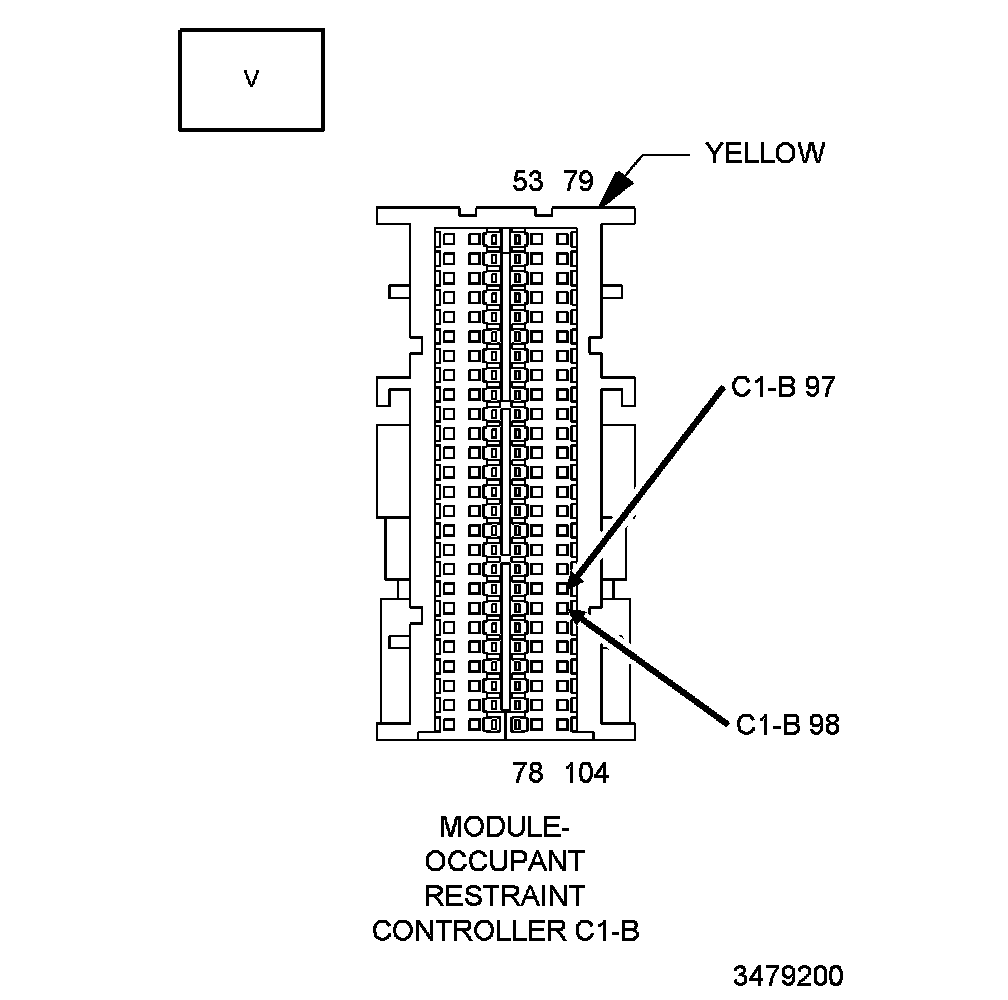 4. Measure the resistance between the (R505) Driver Seat Belt Retractor Tensioner Line 1 circuit and the (R503) Driver Seat Belt Retractor Tensioner Line 2 circuit at the ORC module body harness connector terminals C1-B 97 and C1-B 98.