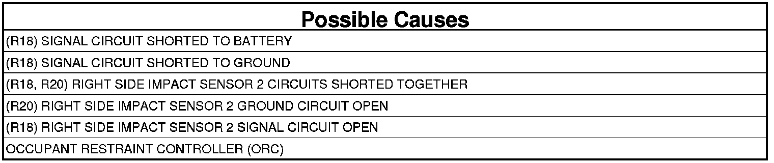 - Repair the (R18, R20) Right Side Impact Sensor 2 circuits shorted together.