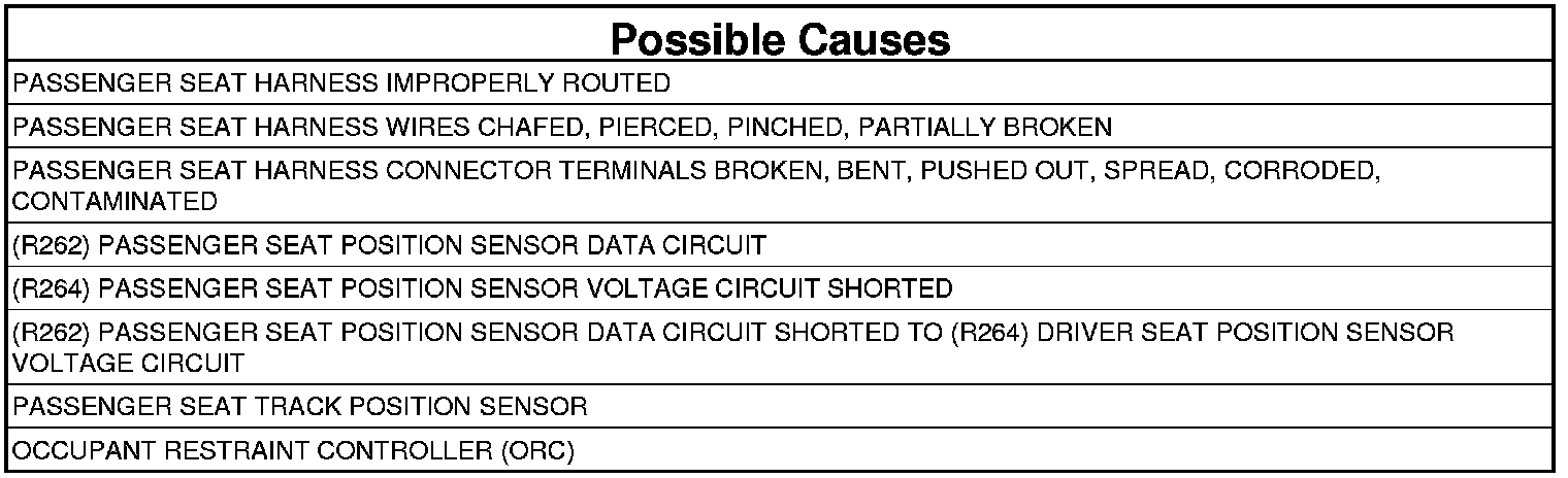 7. CHECK (R261) PASSENGER SEAT POSITION SENSOR DATA CIRCUIT FOR A SHORT TO (R263) PASSENGER SEAT POSITION SENSOR VOLTAGE CIRCUIT