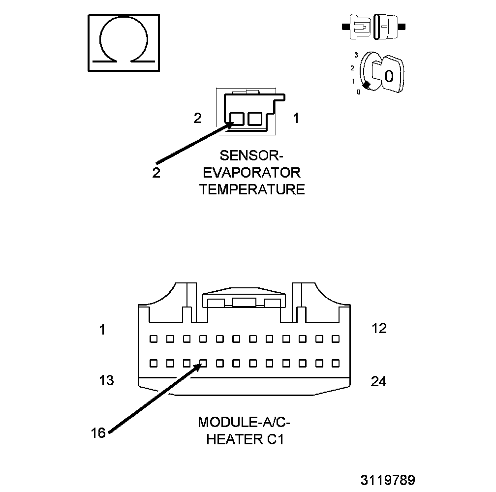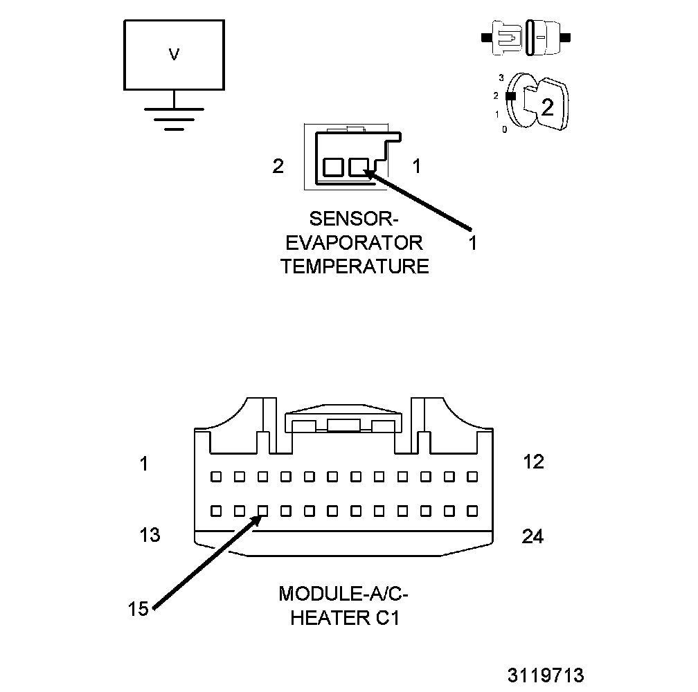 The Evaporator Temperature Sensor is a variable resistor that changes in conjunction with temperature, or otherwise known as a thermistor. The Evaporator Temperature Sensor is located in the HVAC housing downstream of the A/C evaporator. The A/C Heater Module monitors the evaporator temperature by monitoring the voltage change of the Evaporator Temperature Sensor Signal circuit. If the monitored voltage drops below or rises above a predetermined voltage, a Diagnostic Trouble Code (DTC) will set. For further information Evaporator Temperature Sensor - Operation.