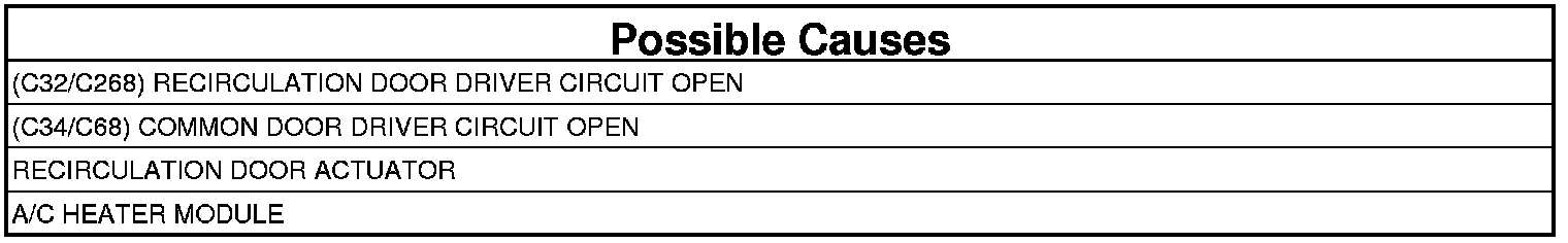 The A/C Heater Module detects an open in the Recirculation Door control circuit. If the A/C Heater Module detects a valid current draw, the DTC will change from Active to Stored and will stay in the controllers memory for 100 ignition cycles.
