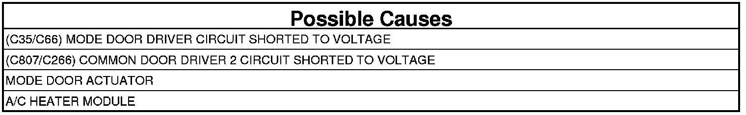 - Repair the (C35/C66) Mode Door Driver circuit for a short to voltage.