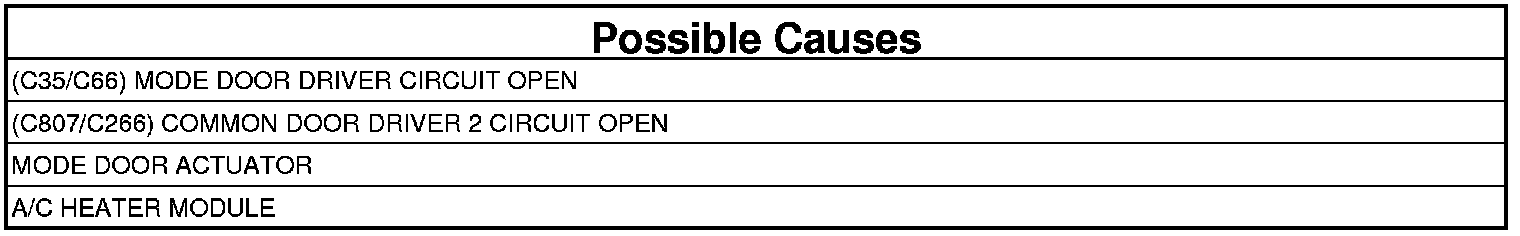 - Repair the (C35/C66) Mode Door Driver circuit for an open or high resistance.