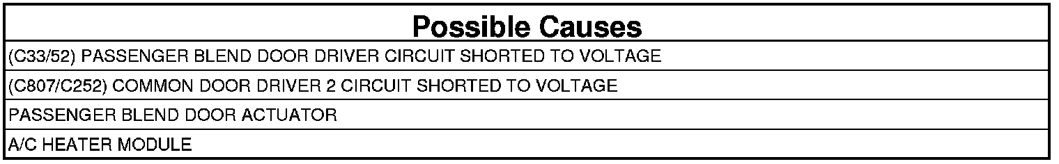 - Repair the (C33/52) Passenger Blend Door Driver circuit for a short to voltage.