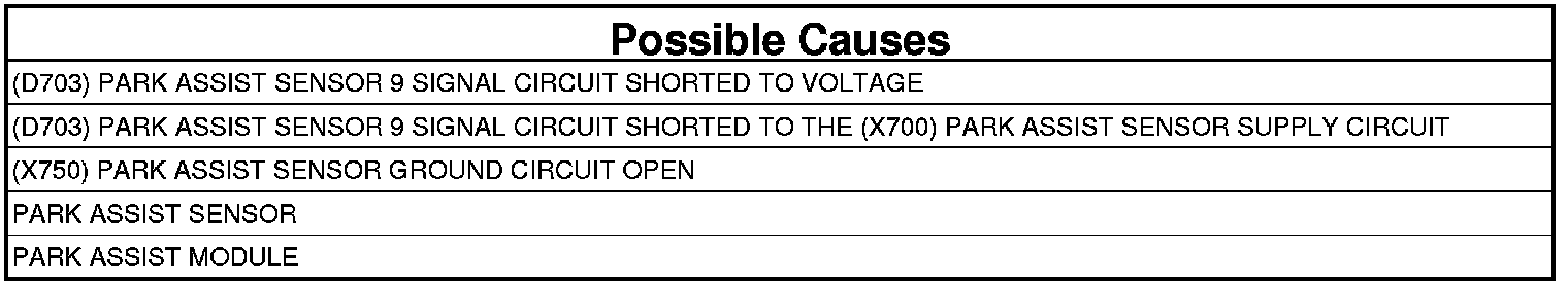 - Repair the (D703) Park Assist Sensor 9 Signal circuit for a short to battery.