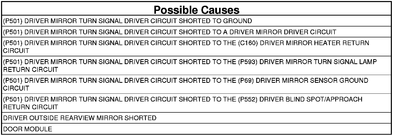 2. CHECK (P501) DRIVER MIRROR TURN SIGNAL DRIVER CIRCUIT FOR A SHORT TO GROUND