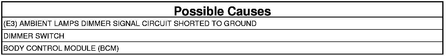 - Repair the short to ground in the (E3) Ambient Lamps Dimmer Signal circuit.