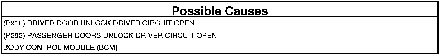 - Repair the open in the (P910) Driver Door Unlock Driver circuit or (P292) Passenger Doors Unlock Driver circuit.