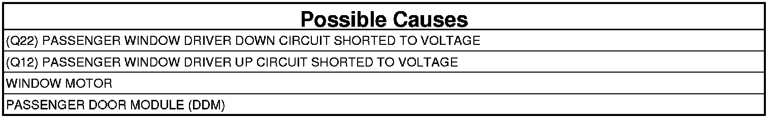 - Repair the (Q12) Passenger Window Driver Up circuit for a short to voltage.