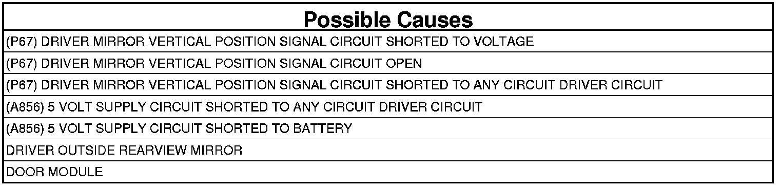 The Door Module senses more than 400 mA current on the (A856) 5-volt Supply circuit or an open or a short high on the (P67) Driver Mirror Vertical Position Signal circuit for more than two seconds.