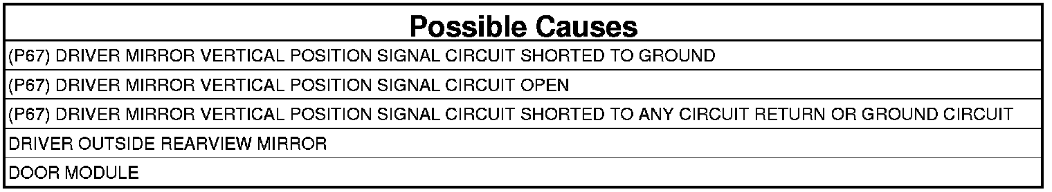 - Repair the (P67) Driver Mirror Vertical Position Signal circuit for a short to ground. If the wiring harness and connector are okay, replace the Driver Outside Rearview Mirror. Outside Rearview Mirror - Removal.