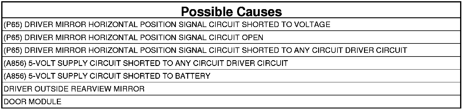 The Door Module senses more than 400 mA current on the (A856) 5-volt Supply circuit or an open or a short high on the (P65) Driver Mirror Horizontal Position Signal circuit for more than two seconds.