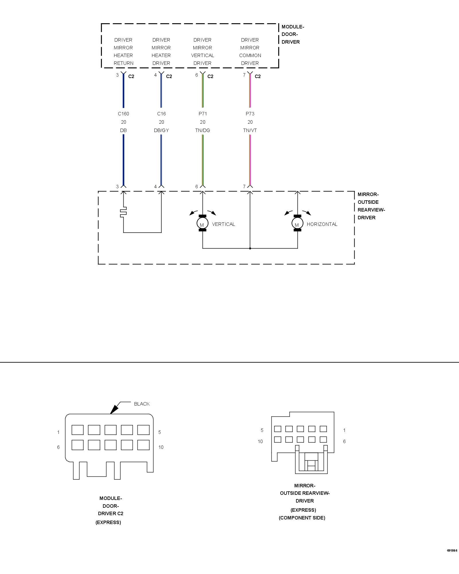- Repair the (P71) Driver Mirror Vertical Driver circuit for a short to the (C160) Driver Mirror Heater Return circuit. If the wiring harness and connector are okay, replace the Driver Outside Rearview Mirror. Outside Rearview Mirror - Removal.