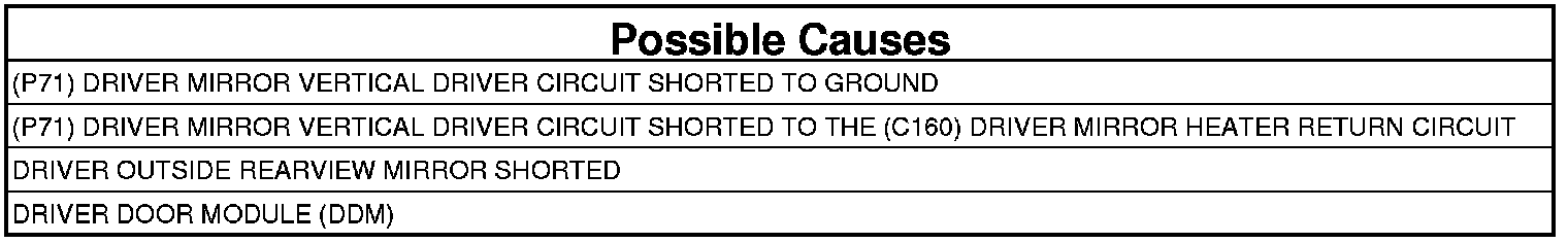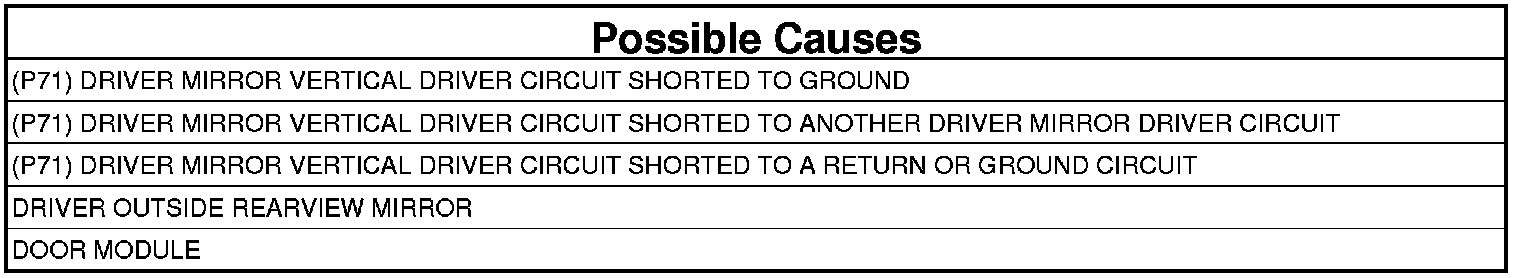 The Door Module senses a short low on the (P71) Driver Mirror Vertical Driver circuit for more than two seconds.
