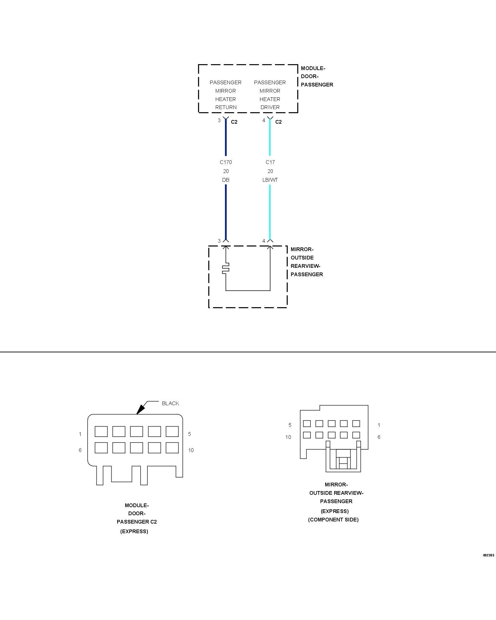 - Repair the (C17) Passenger Mirror Heater Driver circuit for a short to ground or to the (C170) Passenger Mirror Heater Return circuit. If the wiring harness and connector are okay, replace the Passenger Outside Rearview Mirror.