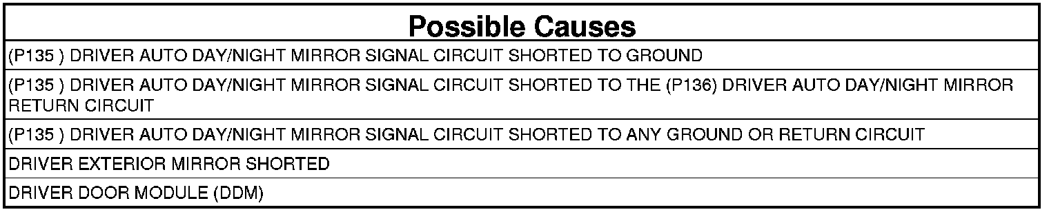 3. (P135 ) DRIVER AUTO DAY/NIGHT MIRROR SIGNAL CIRCUIT SHORTED TO THE (P136) DRIVER AUTO DAY/NIGHT MIRROR RETURN CIRCUIT