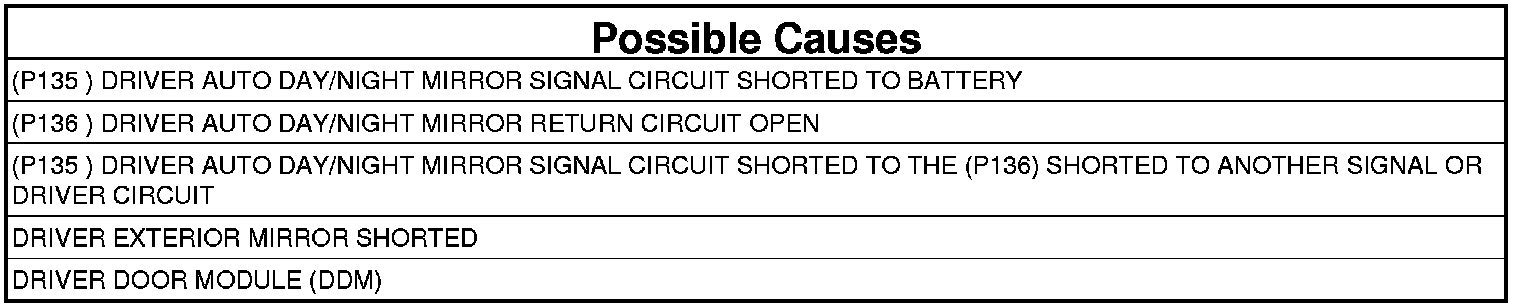 - Repair the short to voltage in the (P135) Driver Auto Day/Night Mirror Signal circuit. If the harness appears good, replace the Mirror. Outside Rearview Mirror - Removal.