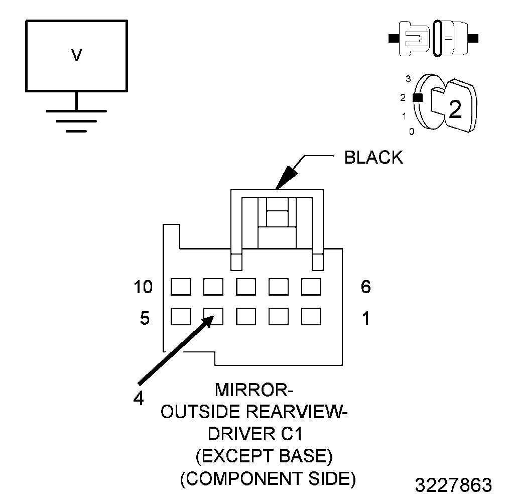 4. Measure the voltage between ground and the (P135) Driver Auto Day/Night Mirror Signal circuit.