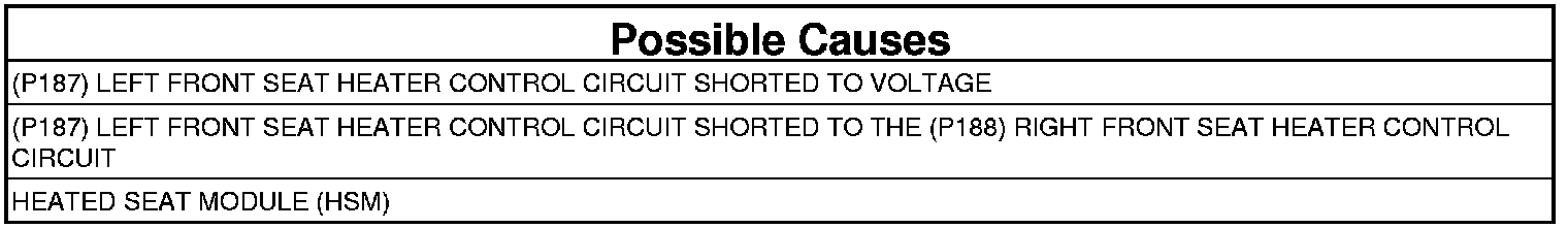 - Repair the (P187) Left Front Seat Heater Control circuit for a short to the (P188) Right Front Seat Heater Control circuit.