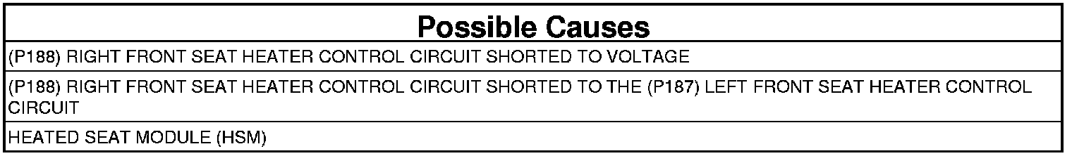 The Heated Seat Module (HSM) detects Voltage above 5.0 volts on the (P188) Right Front Seat Heater Control circuit for more than two seconds with the output turned off.