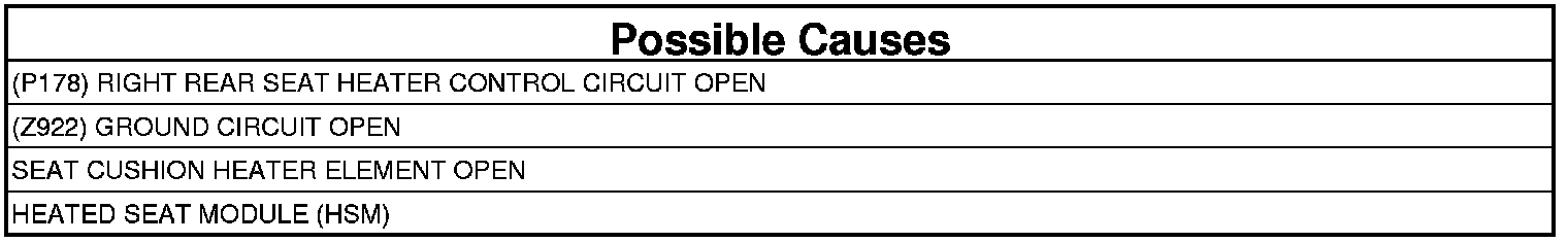 The Heated Seat Module (HSM) detects current below 0.5 of an amp on the (P178) Right Rear Seat Heater Control circuit for more than two seconds with the output turned on.