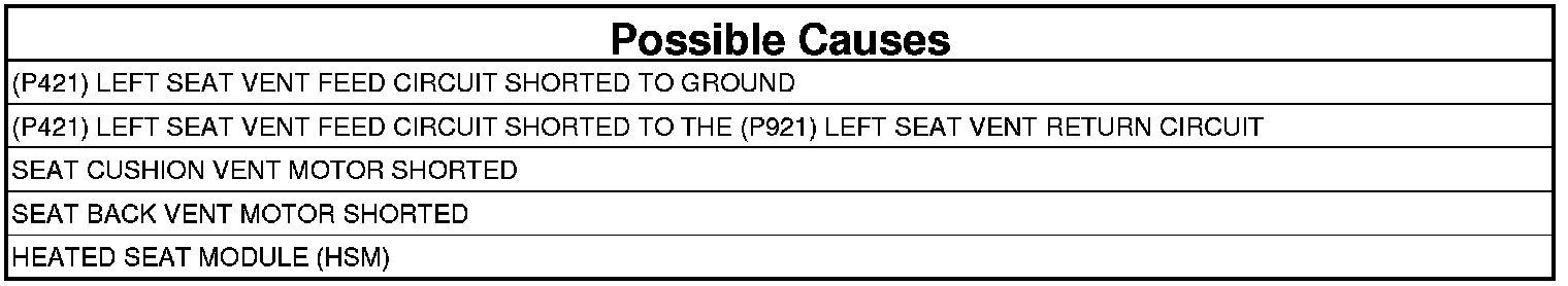 The Heated Seat Module (HSM) detects Voltage below 1.0 volt or current above threshold on the (P421) Left Seat Vent Feed circuit for more than 12 seconds with the output turned on.