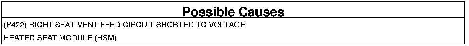 The Heated Seat Module (HSM) detects Voltage above 5.0 Volts on the (P422) Right Seat Vent Feed circuit for more than two seconds with the output turned off.