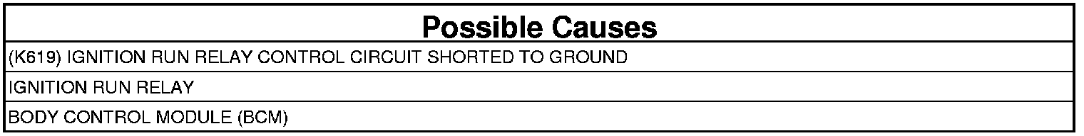 - Repair the short to ground in the (K619) Ignition Run Relay Control circuit.