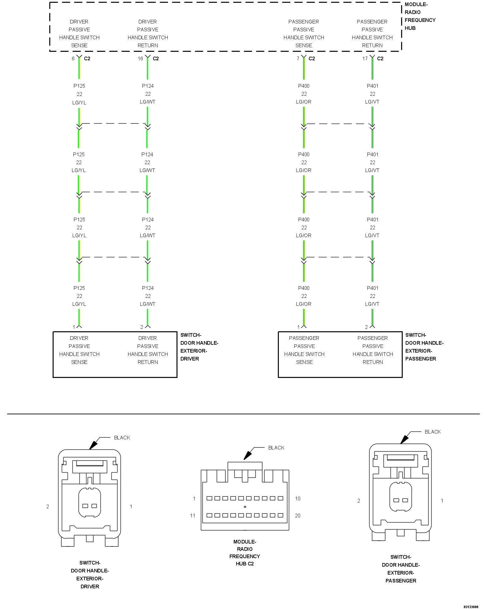 3. Measure the resistance of the (P400) Passenger Passive Handle Switch Sense wire between the RF Hub C2 harness connector and the Passenger Exterior Door Handle Switch harness connector.