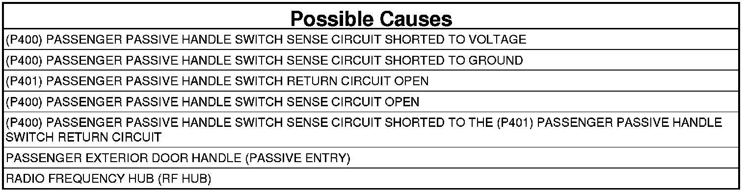 - Repair the short to voltage in the (P400) Passenger Passive Handle Sense circuit.